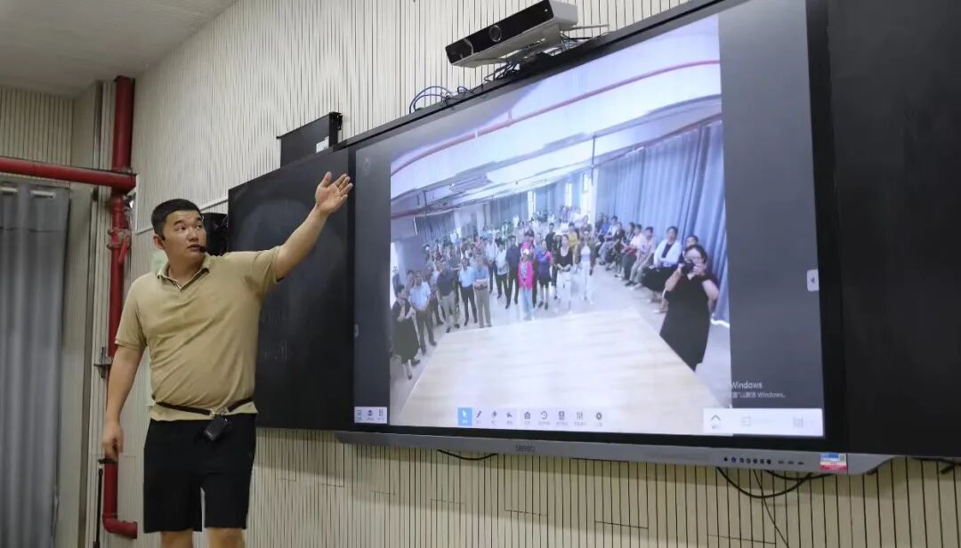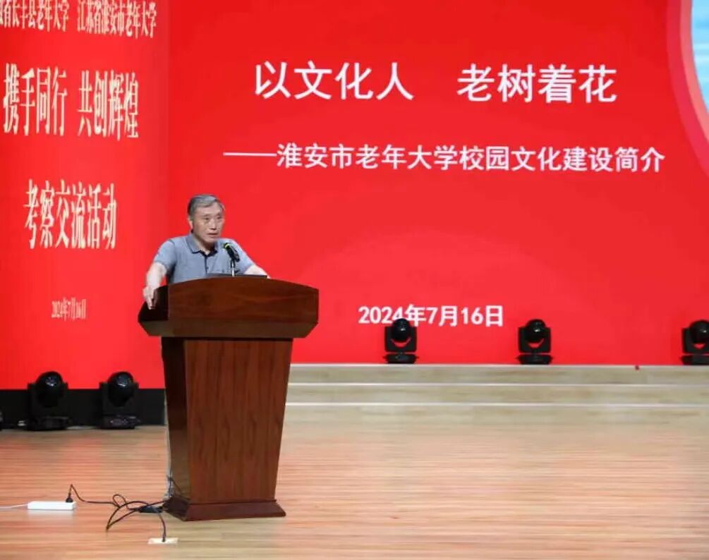 在双方共同开展的“携手同行、共创辉煌”考察交流活动过程中,淮安市老年大学校党委副书记曹启瑞代表淮安市老年大学,对长丰县老年大学嘉宾们的到来表示热烈的欢迎,并分享了《以文化人 老树着花——淮安市老年大学校园文化建设简介》。曹启瑞从打造诗意校园、红色校园、艺术校园、智慧校园、品牌校园、公益校园六个方面介绍了淮安市老年大学的文化建设和教学管理概况。长丰县老年大学副校长薛信银介绍了长丰县老年大学的基本情况、办学成效和主要做法,对淮安市老年大学的热情接待表示诚挚谢意。他指出,淮安市老年大学在办学理念、校园文化建设、教学管理等方面均走在前列,通过此次实地参观学习交流,收获满满、获益良多。他期望未来长丰与淮安两地的老年大学能够持续深化交流与合作,携手为高质量发展老年教育事业合力同行、共创新的辉煌。