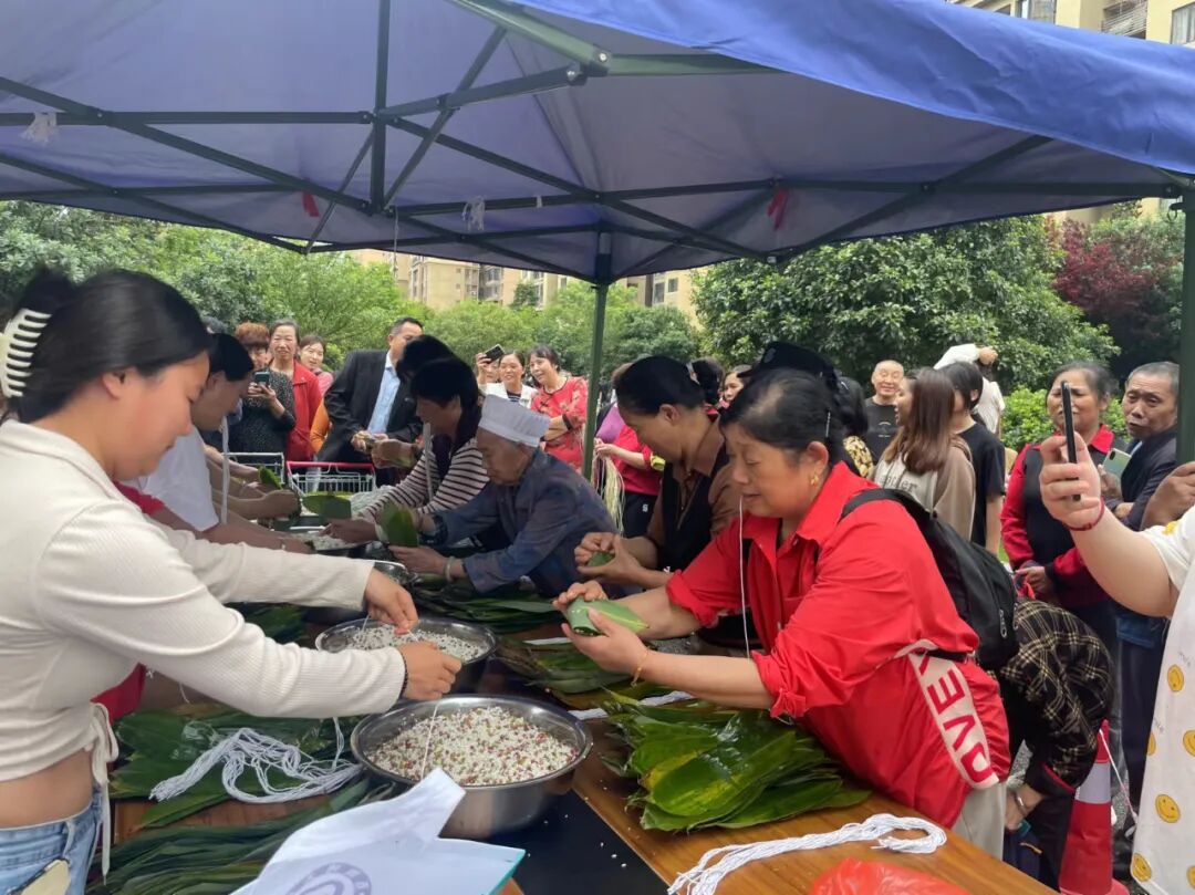 文艺表演结束后,一场别开生面的包粽子比赛拉开了序幕。小区居民和老年学校学员们分组竞技,展现各自的包粽子技巧。现场气氛热烈,欢声笑语不断,经过激烈的角逐,各组的粽子纷纷亮相,形状各异、精致美观。最终,通过社区居民的投票,评选出了最佳创意奖、最佳口感奖等多个奖项。
